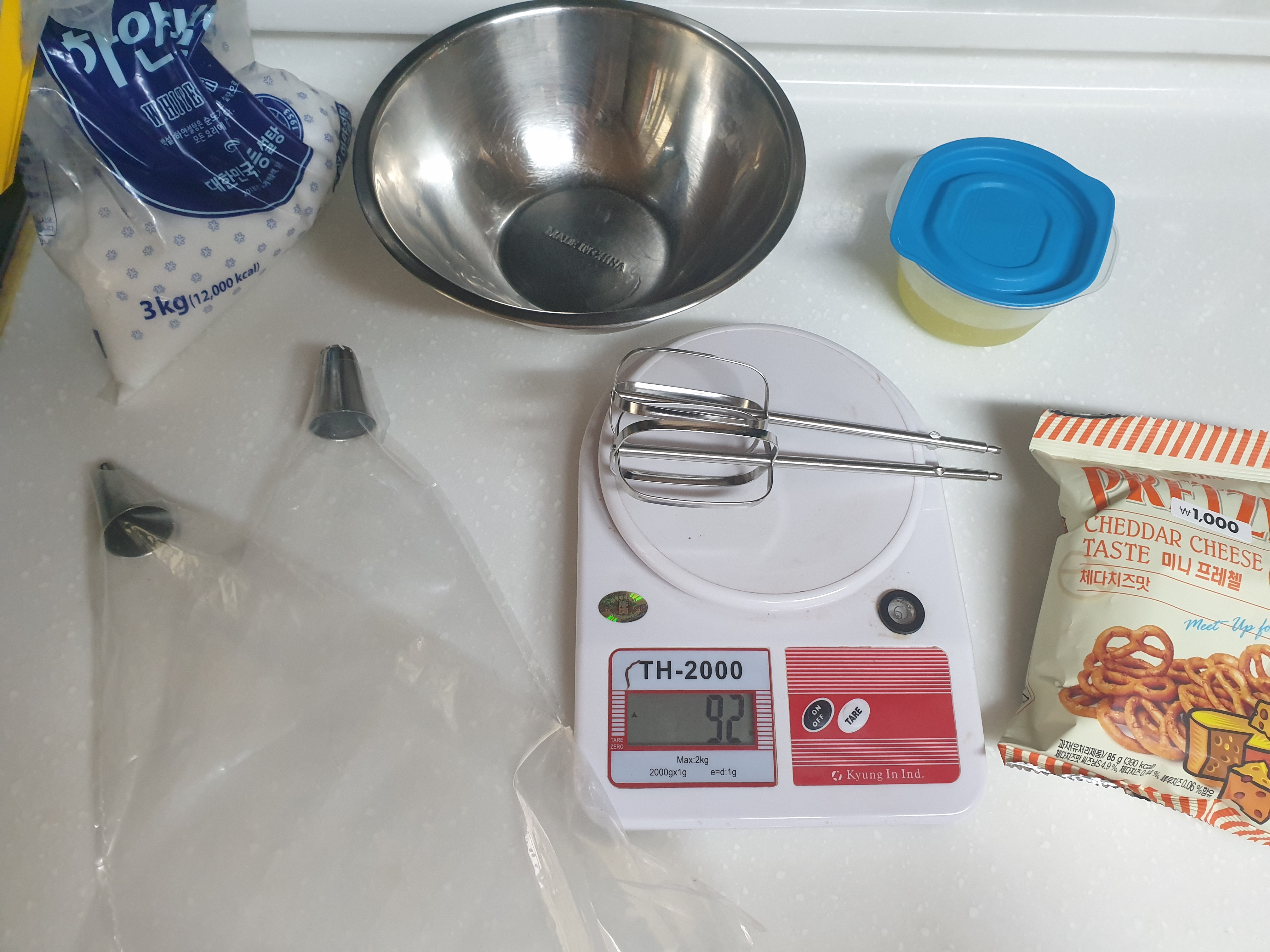 계란 흰자와 설탕, 볼, 저울, 휘핑기, 프레첼,