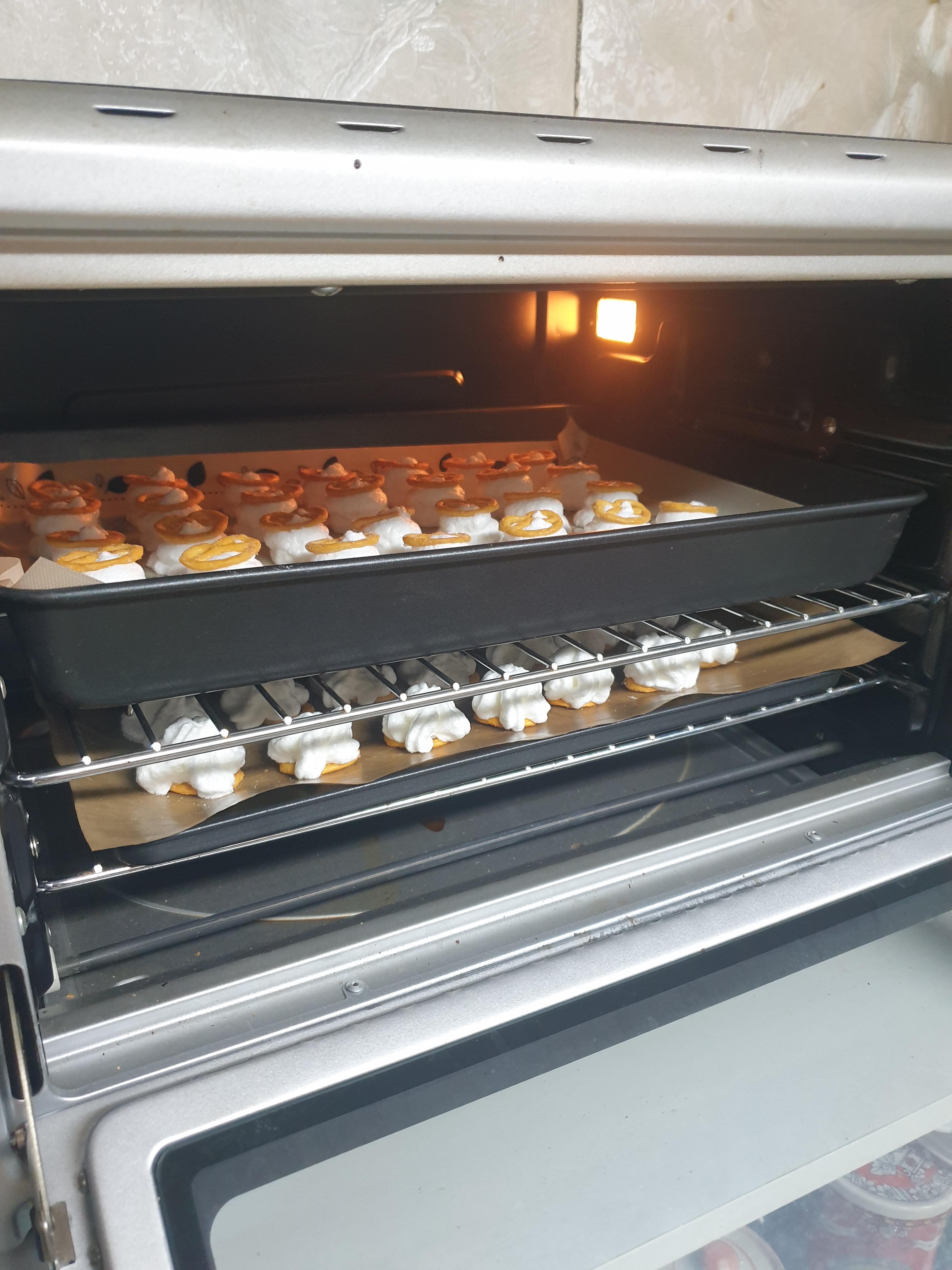 프레첼 머랭 쿠키를 오븐에 넣고 문을 열어줬어요.